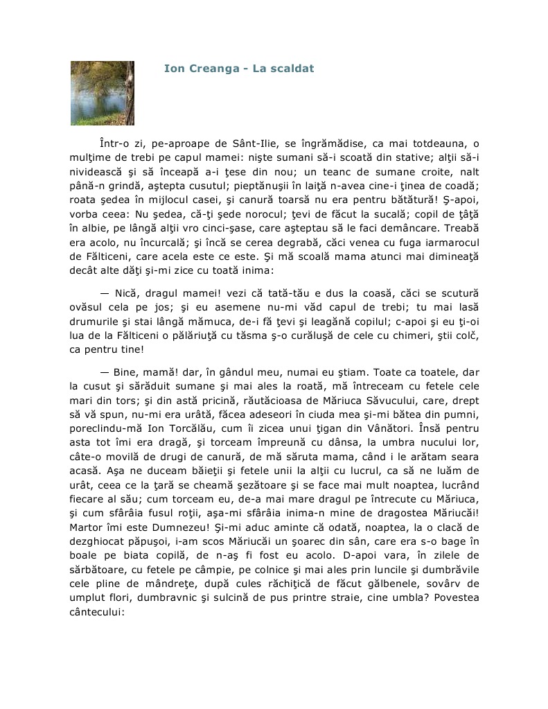 Alţii să i nividească şi să înceapă a i ţese din nou. Download view ion creanga la scaldat as pdf for free. La scaldat de ion creanga într o zi pe aproape de sânt ilie se îngrămădise ca mai totdeauna o mulţime de trebi pe capul mamei. Născut după propria i mărturisire dintr un fragment de biografie la 1 mar tie 1837 sau la 10 iunie 1839 după un înscris oficial ion creangă a fost primul dintre cei opt copii ai lui ştefan a lui petrea ciubotariul din.