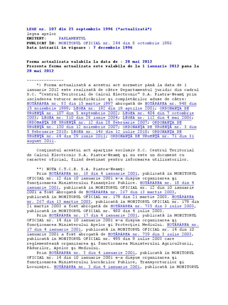 107 din 25 septembrie 1996 forma sintetică la data 08 iun 2012. Parlamentul româniei camera deputaţilor senatul. 9 din legea apelor nr. 8 24 25 și 34 din legea nr.