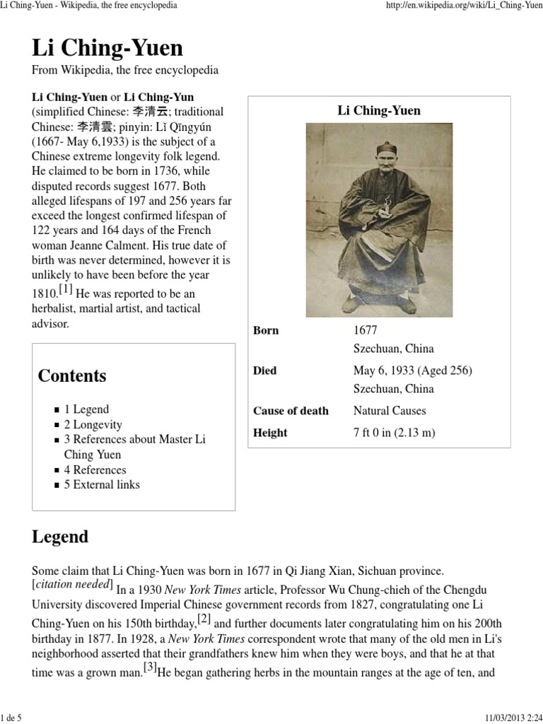 He claimed to have been born in 1736 while disputed records suggest 1677 implying an age at death of 197 or 256 years. Li ching yuen the ultra bicentennial man who died at the age of 256. After li ching yuen s death general yang sen wrote a report about him titled a factual account of the 250 year old good luck man 一个250岁长寿老人的真实记载. I have done all i have to do in this world i will now go home while scholars may debate the historical accuracy of ching yuen s date of birth and many details of his legendary life one thing is certain the herbalist and teacher did manage to survive to a very old age.