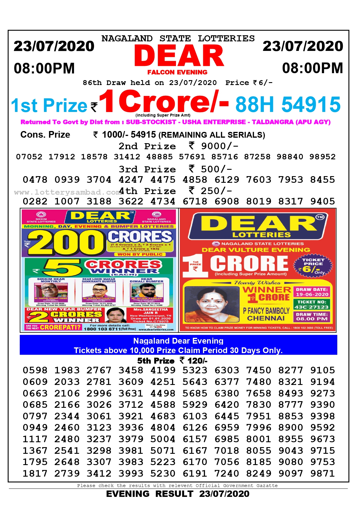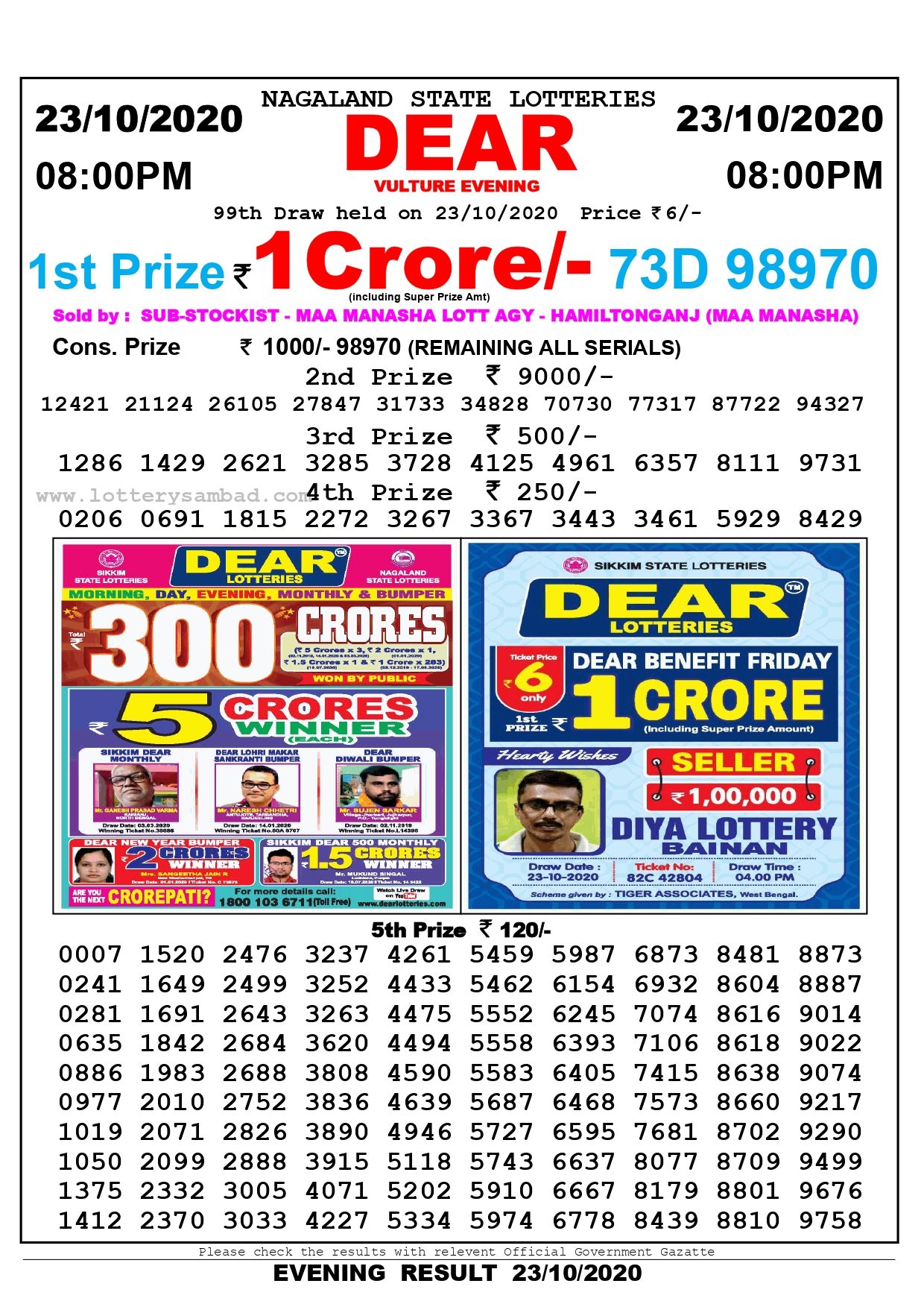 So check your daily lottery ticket result right over here. Lottery sambad 23 10 2020 today results 8 00 pm nagaland state lottery sambad today result 8 pm sambad lottery lottery sambad live result today. As you now lottery sambad draw held 3 times a daw once at 11 55 am second time 4pm and 3rd time 8pm. Here latest lottery sambad results magical pointers are available.