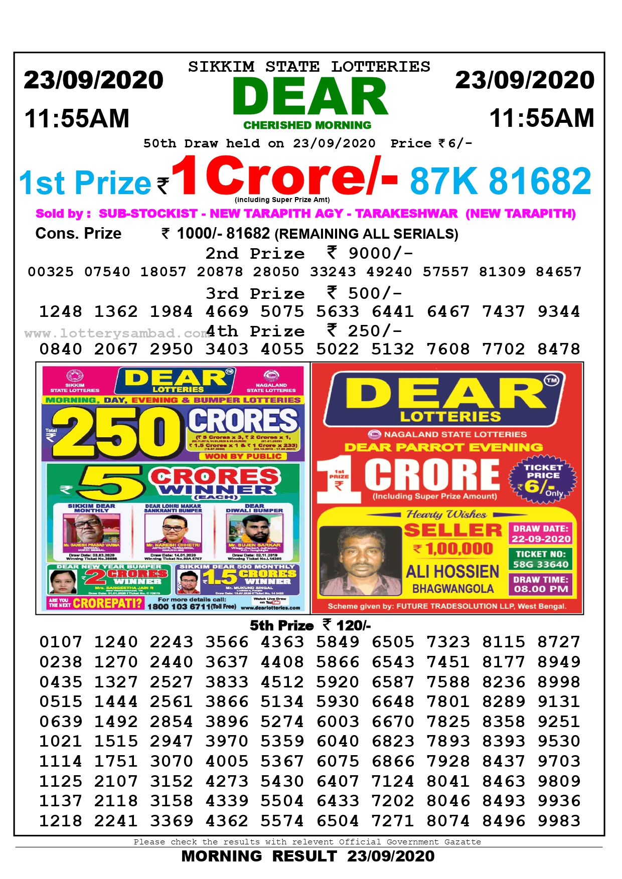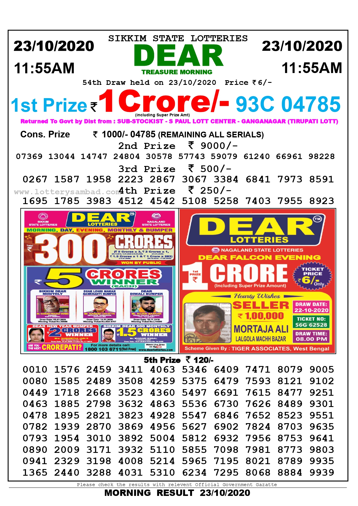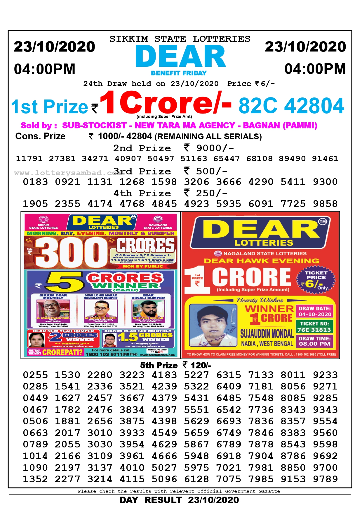 Sikkim state lottery sambad 11 55 am result 23 10 2020 live sikkim state lotteries morning result 23 10 2020 sikkim lotteries result sikkim lottery 11 55 am lottery sambad morning result dear treasure morning result sikkim state lotteries sikkim lottery result 23 10 2. Lottery sambad today result 2020. Watch west bengal lottery dear bangabhumi ajay friday weekly lottery live results with winning numbers list. What are you waiting for.