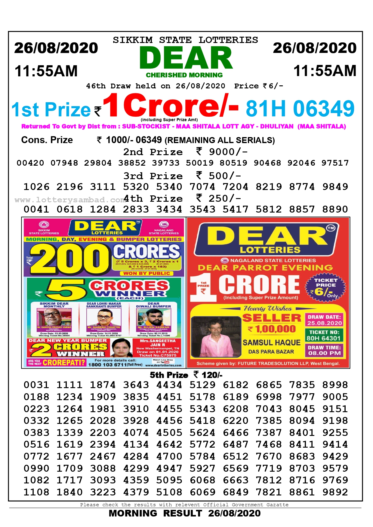 Lottery sambad 26 10 20 morning. This result is also called the dear lottery sambad result. You might be ready to purchase the lottery sambad ticket but be aware of spams and buy a genuine ticket. First dear morning lottery winner 2 5 lakh inr. Before buying the ticket from an agent keep the check on the stamp of the ticket.