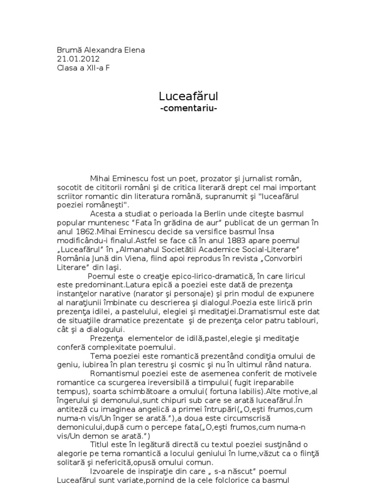 Eseu rezolvat romanitatea românilor 1 eseu rezolvat romanitatea românilor 2. învață să scrii un eseu despre poezia luceafărul indiferent de cerința pe care o vei primi la școală sau la examenul de bacalaureat consultând informațiile de pe această pagină. Daca geniul nu cunoaste nici moarte si numele lui scapa de noapte uitarii pe de alta parte aici pe pamant nici nu e capabil de a ferici pe cineva nici capabil de a fi fericit. Read luceafarul from the story eseu.