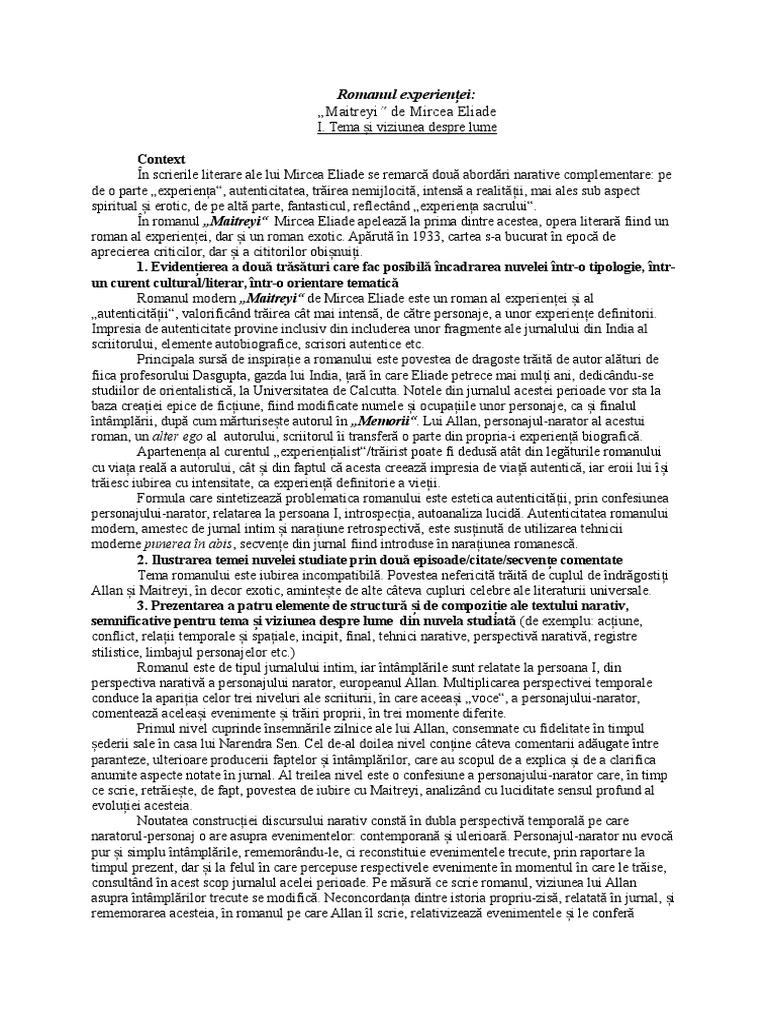 Lume in romanul maitreyi de mircea eliade. Comentariu ultima noapte de. Incadrarea in tipologie a acestei opera este constructia epica in proza de mare intindere cu o actiune complexa la care participa un numar mare de personaje supuse. De asemenea acest material reflectă tema și viziunea despre lume în romanul experienței maitreyi de mircea eliade și răspunde la cerința de la examenul de bacalaureat din data de 27 august 2012 sesiunea august septembrie când elevilor li s a cerut să scrie un eseu în care să prezinte tema și viziunea despre lume într un roman studiat.