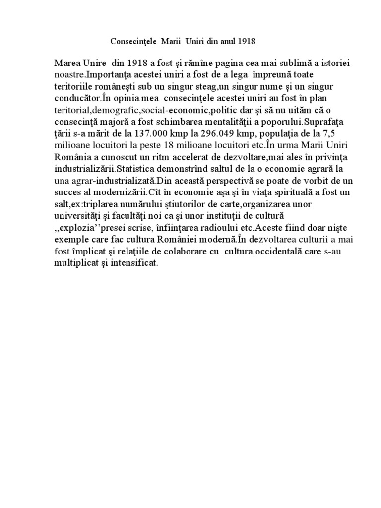 Marea unire 1918 eseu. Pe 16 octombrie marele om politic polonez józef piłsudski proclama existența statului polonez independent. Marea unire din 1918 a fost procesul istoric în urma căruia toate provinciile istorice locuite de români s au unit în anul 1918 în cuprinsul aceluiași stat național românia etape preliminare au fost unirea principatelor române din 1859 și dobândirea independenței în urma războiului din 1877 1878 pe fondul renașterii naționale a românilor în parcursul secolului al xix lea. Marea unire realizarea româniei mari prin unirea basarabiei bucovinei şi transilvaniei cu vechiul regat a fost rezultatul acţiunii româ nilor în conjunctura favorabilă de la sfârşitul primului război mondial când dispăreau de pe harta europei imperiul ţarist şi cel austro ungar. Primul pas spre marea unire a reprezentat o mica unire de la 24 ianuarie.