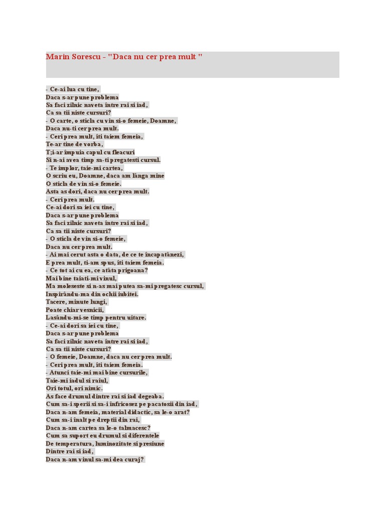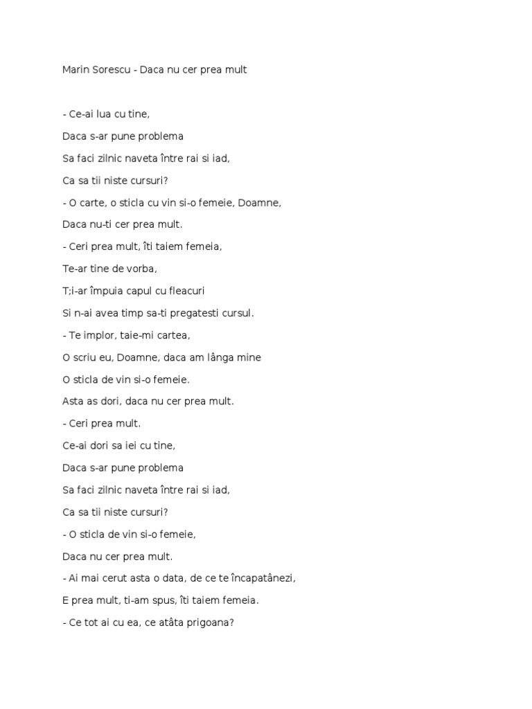 Marin sorescu a scris literatură de toate genurile situându se printre cei mai prodigioși scriitori români și numărându se de asemenea printre scriitorii români reprezentativi și cunoscuți peste hotare. Dacă nu ţi cer prea mult. Ceri prea mult. Ceri prea mult îti taiem femeia te ar tine de vorba ti ar împuia capul cu fleacuri si n ai avea timp sa ti pregatesti cursul.